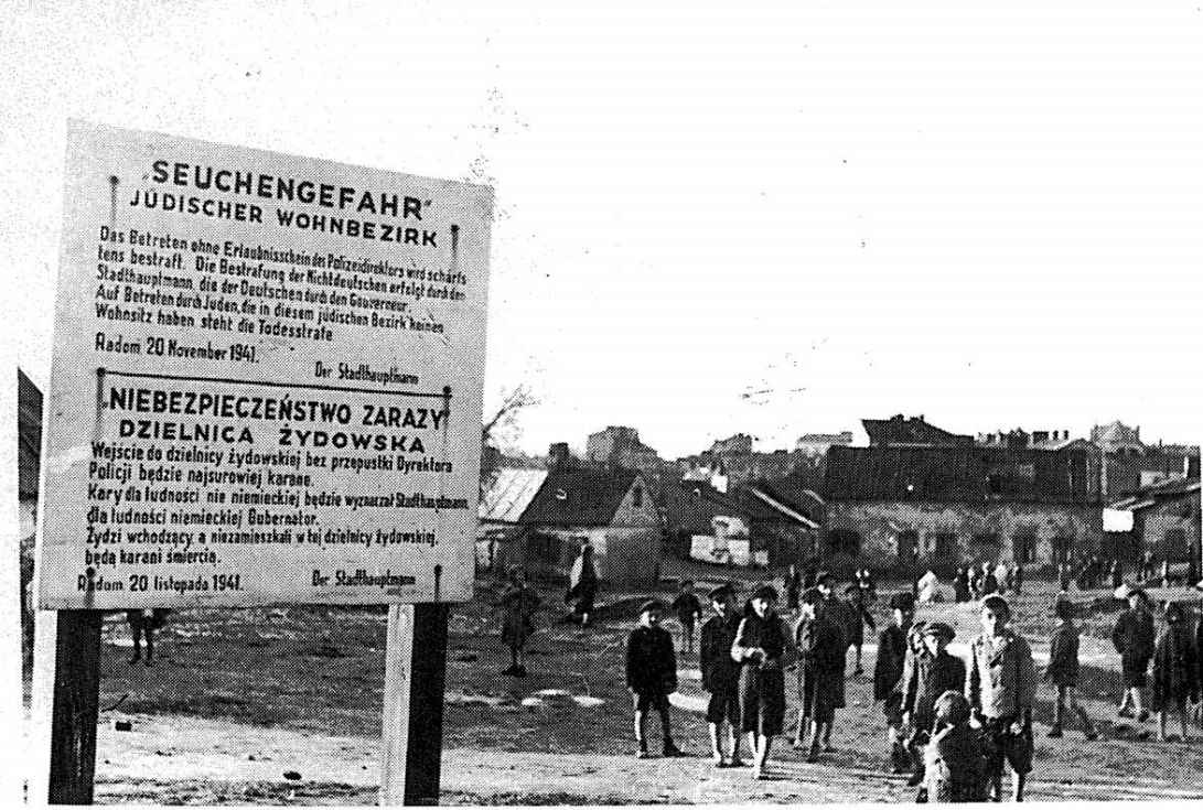 图33 波兰拉多姆(Radom)犹太人居住区。一张公告上写着未经警察允许不得入内,并警告来访者,内有传染病蔓延。居住区内的犹太人被降等为危害健康的怪物,甚至被比喻为国家体内的“病菌”、“癌症”,遭到犹太“污染”的国家必须接受净化。慕尼黑巴伐利亚州府档案馆藏。