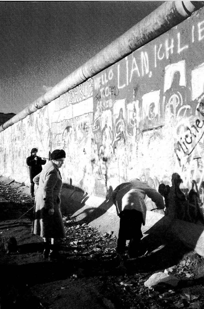 图37 人们从已经被废弃的柏林墙上凿出纪念品,一位西德退休老人在旁观看。摄影:科尼利·尤斯伯恩(Cornelie Usborne)。