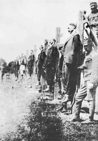 一九一四年八月弗里德里希大公下令,“凡是个人,乃至整个族群,犯下叛国罪者,都该以最残酷手段将其打倒”。图中是因被怀疑站在俄国那一边遭处决的乌克兰人。