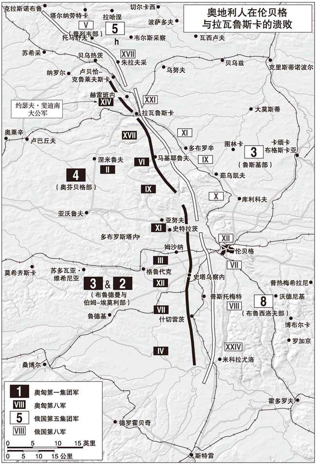 康拉德命布鲁德曼和伯姆-埃尔莫利在韦列齐察河边顶住俄军,奥芬贝格则在同时率第四集团军往东南走,穿过拉瓦鲁斯卡,打击俄军侧翼。第三、第二集团军要顶住俄军够久,以使这一钳形攻势得以发动。若非有这么多人因康拉德的连番出错而精疲力竭、断手断脚或丧命,他远在战场之外,像在参谋部地图插图钉般调动已被他操纵得战斗力大失的部队之作为,会让人觉得好笑。一如波蒂奥雷克,康拉德的表现显示他完全不懂怎么打真枪实弹的战争。[40]经过过去这个星期的征战,奥芬贝格部已几乎动不了,更别提与敌厮杀,他有太多马已伤重而死、饿死、累死。博罗耶维奇建议他麾下将领,“把补给部门的马拨给弹药车队用;把弹药车队的马拨给野战炮兵连用”。没打仗时,士兵奉命尽量多抓脱队的军马回来给部队用。配发的枪已丢失或受损者,则被告知到外面地上找枪替补。[41]