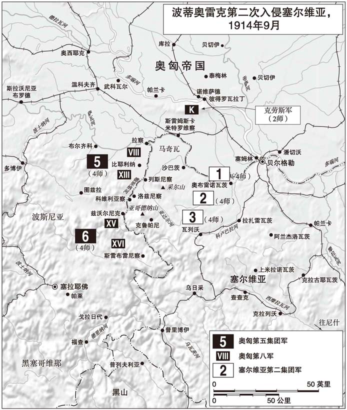如果说奥匈帝国北方面军全军需要援救,那么它在巴尔干半岛上的部队亦然,而且最需要救的就是该地的全军最高指挥官。自八月大败之后,奥斯卡·波蒂奥雷克将军就成了笑柄。有人说他“无能”、“饭桶”,还有更难听的说法。[1]波蒂奥雷克决意让那些批评他的人闭嘴,打算于九月再度入侵塞尔维亚。这有其风险;康拉德正在加利西亚全面撤退,波蒂奥雷克若要动手,就得将就着使用比他八月时还少的兵力:只有战斗力大减的奥匈帝国第五、第六集团军,旧第二梯队已开赴东部战线,帮不上忙。