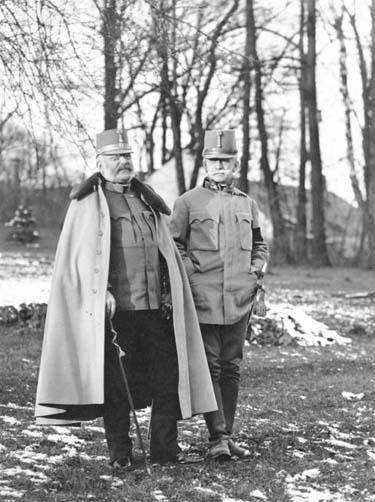 奥匈帝国士兵在前线受苦时,弗里德里希大公(左)与康拉德(右)却在弗里德里希位于泰申的西里西亚府邸里设立了豪华的总司令部。哈布斯堡王朝军队于东边一百二十公里处垮掉时,据军官记载,这两位司令官仍维持老百姓般的生活作息(小睡、漫长的午餐、散步、读报数小时)。