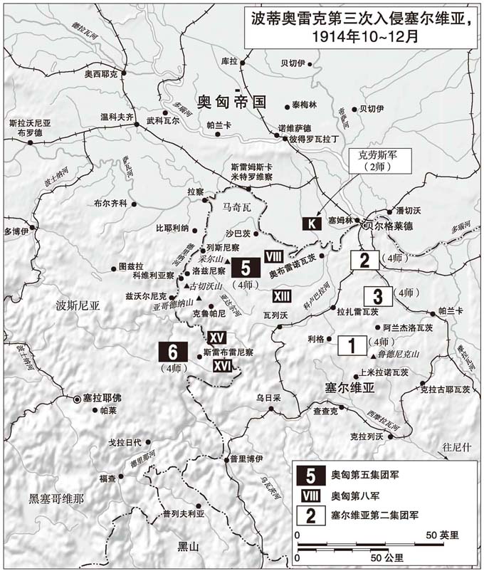 为免落得这一下场,弗朗茨·约瑟夫皇帝已批准第三次入侵塞尔维亚。十月中旬,奥地利在这时已很熟练地在萨瓦河、德里纳河的河湾处集结二十万大军,再度攻入塞尔维亚。波蒂奥雷克自信满满地宣告:“第五、第六集团军的将士,此战的目标——彻底击败敌人——就快达成。”他避谈八月、九月两次失败的入侵,只谈这次更有可为的入侵,预言“三个月的战役就快结束;我们必须在冬季来临前击溃敌人的最后抵抗”[3]。