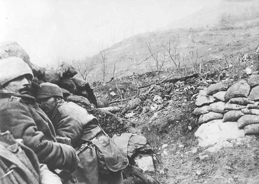 在奥匈帝国医院接受治疗的塞尔维亚伤兵所表现出的坚忍,令每个人吃惊。“他们入院时浑身是土,用树枝固定骨折处,就和他们在战场上所受的包扎一样。有时髋部骨折会用树的大枝捆缚住,大枝从人的脚到腰。”[58]在战场上,塞尔维亚人的冷血同样令人注目;他们在每个地方都挖掘漂亮的壕沟线,并构筑侧翼阵地,然后躺在里面一动不动,不发出声响、亮光,不移动身子,直到奥地利人直直走进来,被他们近距离撂倒为止。”[59]