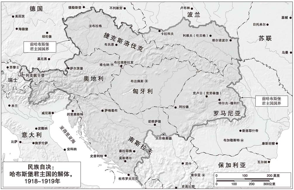 但俄国熊的垮掉也救不了奥地利。哈布斯堡君主国已分裂为数个得到协约国帮助的“民族委员会”,这些委员会受邀于巴黎和会上表达他们各自的民族独立主张。德国于《凡尔赛条约》中受到人尽皆知的惩罚,奥匈帝国则在《圣日耳曼条约》(the Treaty of St. Germain)、《特里亚农条约》(the Treaty of Trianon)两条约中寿终正寝。这两个条约于一九一九年正式裂解哈布斯堡帝国,创造出波兰、捷克斯洛伐克、匈牙利三个新国家,强化既有国家(例如罗马尼亚)的版图。塞尔维亚吸并维也纳的原南斯拉夫土地,成为名叫南斯拉夫的新国。在其他所有民族都退出后,由哈布斯堡王朝仅存的小块土地,即维也纳至因斯布鲁克之间的德意志人地区,郁闷地组成奥地利共和国,且受条约所束,严禁与北边大上许多的德意志人国家合并。
