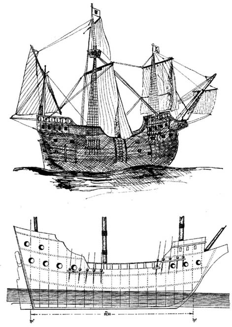 然后,水手们乘小艇来到大船上。在节奏感很强的钹声中,船帆升起,小艇被推开,达伽马的旗舰“圣加百列”号升起了王旗。水手们向天举起拳头,吟唱着传统的呼唤:“一帆风顺!”在口哨声中,小船队在风力驱使下开动了,由两艘克拉克帆船引领,它们的船首载着大天使加百列和拉斐尔的木刻像,涂色非常美丽。人们涉水前行,隔着越来越远的距离,再望自己的亲友最后一眼。[22]“就这样,一群人转身眺望陆地,另一群人望着大海,同样涕泗横流,思虑着那漫长的旅途。他们保持这个姿态,直到航船远离了港口。”船队顺塔霍河而下,直到经过河口,开始第一次感受到大洋的刺激。