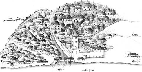 地势低洼的马六甲城被河流分成两个部分,加斯帕尔·科雷亚在葡萄牙人占领马六甲并建造要塞不久后绘制了这幅图