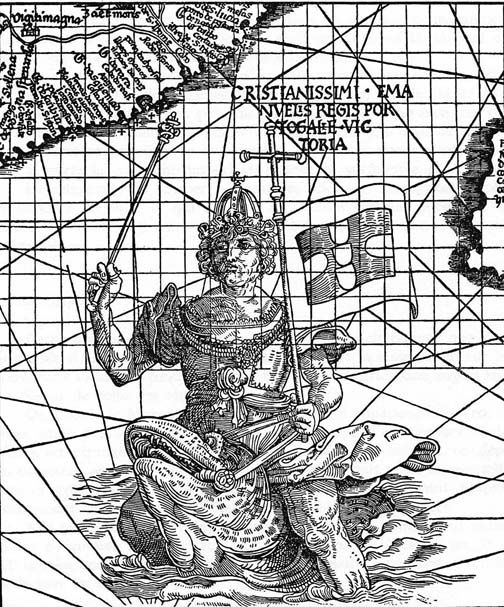 德意志地图师马丁·瓦尔德西米勒于1516年绘制的世界地图,将曼努埃尔一世呈现为海洋的君王