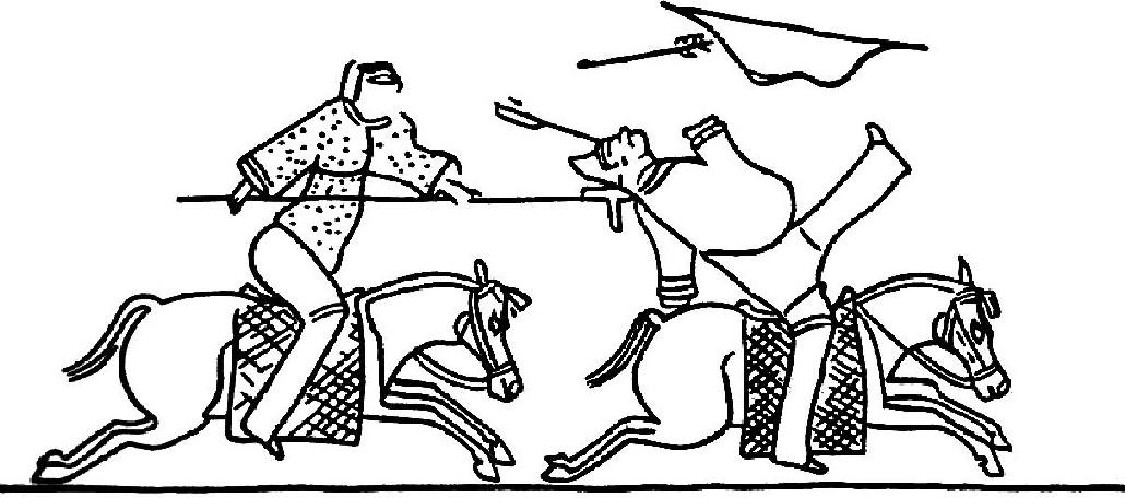 由于《史记》等文献对当时战争少有正面描写,许多战术细节的复原只能求诸考古材料和后世文献。战术转型首先带来了骑兵武器的变化:长戟取代弓箭成为汉军骑兵的作战兵器。长戟是秦汉步兵的普遍装备,所以这种技术移植比较便捷。在没有马镫的情况下,用长戟冲刺敌人可能将自己也顶下马背,但这对敌人造成的损失毕竟更大。关于中原骑兵与游牧骑兵作战的具体细节,在东汉画像石中能找到一些参考。比如山东孙家村、孝堂山画像石表现的,正是用戟和弓箭的骑士互相作战的场景。在孙家村画像石中,一名持戟的骑士正在刺死一名持弓箭骑士。研究者认为,持弓箭者的尖顶帽代表了草原游牧族的典型装束,而持戟者的铠甲则是中原骑兵造型。[34](见图1)值得注意的是,山东的汉代画像石中,这种持戟骑士正在刺死尖顶帽弓箭骑士的场景多次出现,其构图风格也基本相似,说明时人十分重视这种战术的威力。[35]