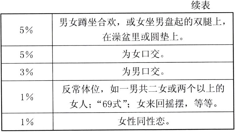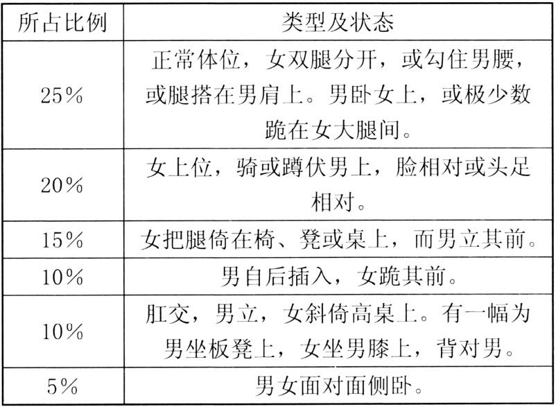当然高氏的统计不是没有错误。比如在上表中没有任何男同性恋的位置,而实际上明代春宫图对男同性恋是有反映的——至少《花营锦阵》第四幅就是。但高氏将此幅误认为是肛交,犯了一个作为明代春宫图鉴赏权威绝对不应该有的大大“硬伤”(参见本书“高罗佩《秘戏图考》与《房内考》之得失及有关问题”一文第四节)。
