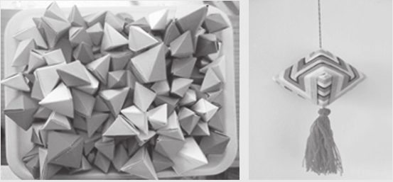 师生准备好较硬一些的广告纸,裁成2—3厘米宽的长方形纸条,从一端开始折三角形,最后折成左图的样子。师生在此基础上,选择喜爱的五彩丝线开始缠粽子,制作成右图的样子。