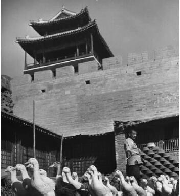 咱们再讲这鸭子,鸭子房也是一排一排的,前边用这个篦子,现在有这老照片,有的是木头的,放上水,但是大多数都是雇人,就在这护城河里放,这一间房里,大约啊,就是养50到80只。为什么叫大户呢,它就一次能养几千只,比如四五十间房,二三十间房。其他小的就都提不上了。比如你也养,你是小养殖户,就不行。这是固定的。