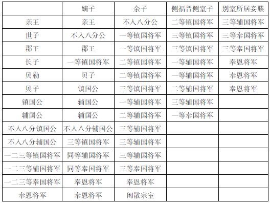 清代皇族封爵始于崇德元年,皇太极定宗室爵位分九等:一等和硕亲王,二等多罗郡王,三等多罗贝勒,四等固山贝子,五等镇国公,六等辅国公,七等镇国将军,八等辅国将军,九等奉国将军,其余为宗室。