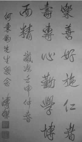 何:啊,后来把那个肿瘤开出有多大?有茄子那么大。一约(称)呢,是两市斤,完了以后这疼痛就全没有了。我心态特好,这我老伴知道,我特爱帮助人,这是没病的时候,与人为善,你看这是杰二爷注174对我的评价:“乐善好施仁者寿。”我经常给人看病。专心勤学博而精,他说我学的东西太多了,满文吧,我还教过日文,高等自学考试,我日语通过了。我的俄文可以教到初中,但是我没考过本儿,从五几年学俄文到现在我不忘,我一点儿也不精。