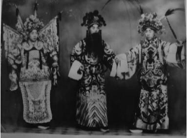 1940年前后父子合演《黄鹤楼》剧照(左起:关嘉禄大哥饰赵云、父亲饰刘备、二哥饰周瑜)(关嘉禄提供)