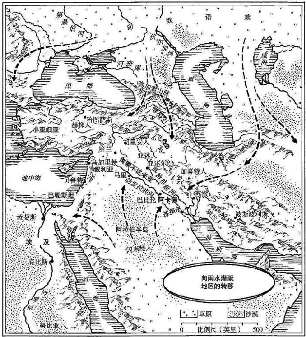 关于向降雨地区的转移如何发端的详细情况,我们不得而知,尽管这一事实不容置疑。例如,到公元前2000年左右,美索不达米亚周边诞生了一系列卫星文明或前文明,其中小亚细亚的赫梯社会、叙利亚的迦南和巴勒斯坦最为著名。埃及沙漠阻止了尼罗河两岸任何类似文明的发展,但是印度河流域文明的因素可能,也许很可能向南、向东渗透,影响了南部和中部印度非灌溉地区各民族的生活,尽管还没有考古材料能够证明。