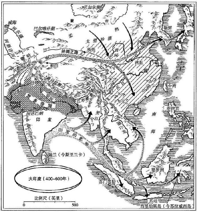 佛教对朝鲜和日本的影响具有更深刻的特点。这两个国家先前都不存在值得夸耀的、非常令人印象深刻的文化。当中国正在迫切地吸收佛教时,它们发现自己处于中国影响范围的最边缘。因此,正是披着佛教外衣的中国文明吸引了朝鲜的国王及其宫廷,公元372~528年,四分五裂的朝鲜各国国王把佛教定为国教。由于更加遥远,所以日本更无准备吸收最近的中国文明模式。但是,公元552年,一个佛教传道僧团到达这个“日出之国”,并取得了重大的成功。从此,日本列岛就加入了以中国为中心的文明(和半文明)国家之列。