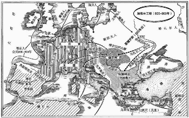 两种其他重要变化增加了新兴欧洲社会中世纪制度的范围和力量。一是重犁的传播,这在前文已经提到(第201页)。以这种犁为基础的农业为维持足够的骑士、使欧洲变得真正强大提供了必要的经济基础。第二个是欧洲北部海域贸易的发展。海盗和海上打劫者很快便发现,当抢劫不再易行时,贸易可能是有利的。四处流动的商人、水手、业余海盗常常发现,在一个比较永久的基地定居下来是比较方便的,只要那里的交通路线和安全的港口能够带来适当的场所。中心就以这种方式形成了,后来中世纪欧洲城市生活就兴起于欧洲北部的这些中心。对未来西方文明发展最重要的是,第一批欧洲城市居民习惯于自己管理自己的事务,反对任何外来干预者。这赋予西北欧市民阶层显然不同于其他文明的市民所习惯的、更自信的生活方式,而其他文明盛行保护社会优越者和礼貌地迎合地主和官员。