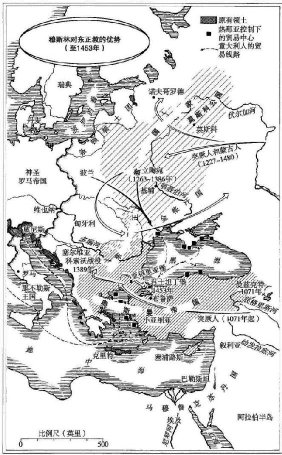 在东正教徒看来,穆斯林突厥人比拉丁基督徒更好些。在损害东正教永恒真理的情况下,拉丁人还强迫东正教徒接受他们的基督教教义。相反,无论出于什么原因,穆斯林随时允许基督徒继续举行他们习惯的宗教仪式。此外,教会的神学家正式把伊斯兰教列为基督教的异端,因此,从神学上看,穆斯林的错误真的不比拉丁教会的分裂更糟糕。此外,奥斯曼突厥人第一次出现于巴尔干半岛时,与先前的基督教徒比,他们的税赋的确不太沉重。的确,突厥人遵守“神圣”法律,给予基督教臣民更大的地方自治,这是他们不可能在任何基督教统治者统治下都可以享受到的。因此,如果必须在两者之间进行选择时,东正教徒每次都偏向于选择突厥穆斯林,而反对拉丁基督徒。当1453年君士坦丁堡落入突厥人之手时,他们的选择才告结束。几乎相同的因素也适用于更北边的俄罗斯森林地区,那里的统治者,如亚历山大·内维斯基(卒于1263年)就英勇地抵抗了拉丁人的征服,但后来却服服帖帖地臣服于蒙古人。