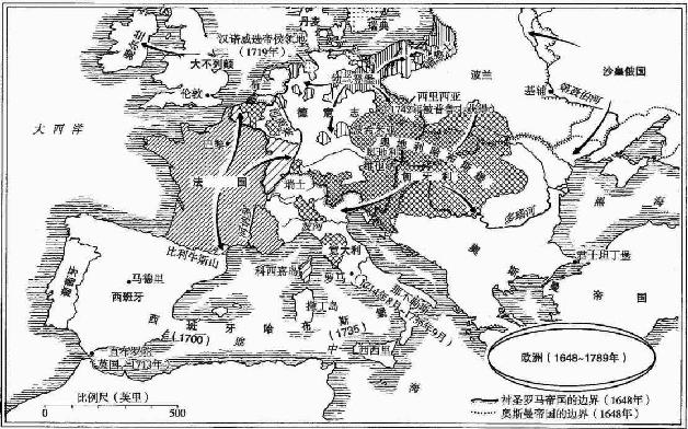 中欧仍然是欧洲西部与东部均势的过渡地带(而且也经常是战争的舞台)。意大利和德国被《威斯特伐利亚条约》(1648年)分裂而成的小国要么继续倾向法国,要么参加反法同盟,这取决于当地的形势和对手、王朝关系,或者(至少有时)直接倒向出价最高者。