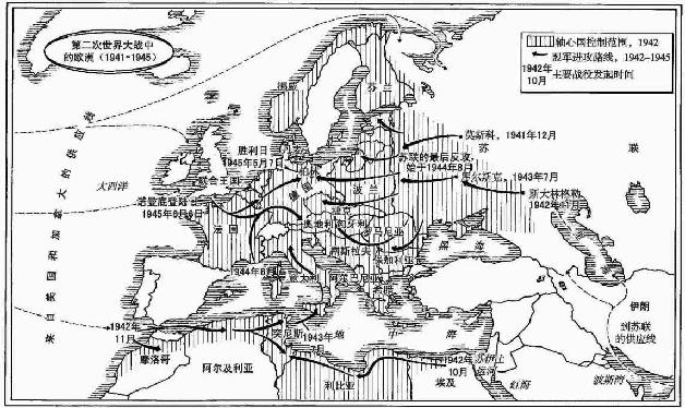 现在德国在地中海几乎是孤军作战。1942~1943年主要的战斗集中在苏联边界。1942年夏,德国军队重新开始大规模进攻并且渗透到位于斯大林格勒的伏尔加河一带。在这里他们停止不前了。1942年11月到1943年2月,苏军击退德军,并且整个拦腰截断了正在进攻的德军。当1943年德国军队试图重新发动进攻时,苏军很快扭转战局。此后德国转入防御,从苏联的土地上节节败退。1944年夏末,苏联军队跨越战前边界并向柏林进军。