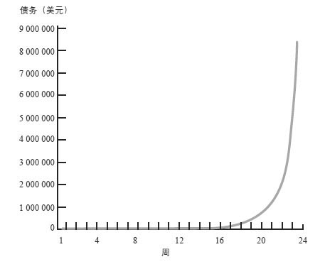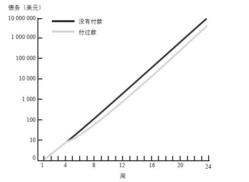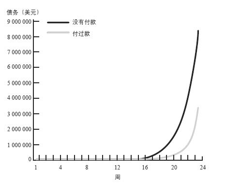 当然,按照这个标准,我的债务在前几个星期的增长实在是微不足道,从1到2到4,再到8美元。可是假如我买了那杯咖啡后的一个月左右,碰到了黑帮老大手下的一个小喽啰,那时我的债务是16美元。假设我没有16美元,但给了他5美元。考虑到自身安全,我坚持每周偿还5美元,持续了4周,可接着就又一走了之了。图3-4中的黑线代表没有任何还款的情况,而灰线则代表坚持5周,每周还5美元之后的债务增长情况。我那杯咖啡最后仍然花了不止300万美元,却只相当于一分未还情况下最终利息的一半还不到。这至关重要,然而在图中却无法看到。从图3-4中无法得知为什么在结尾处灰线比黑线低那么多。