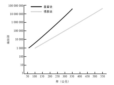 基督教的传播速度甚至超越了佛教。公元32年左右,耶稣去世,他当时只有大约几百名追随者;到了公元391年,当皇帝狄奥多西宣布基督教为唯一合法的宗教时,已经有超过3000万罗马人改信基督教,尽管“改宗”是一个很笼统的词汇。当时尚有一些受过高等教育者对此保持怀疑,他们在接受新的信仰之前,仍试图用强大的逻辑性和严密性深刻探究教义内涵。然而只消一下午时间,基督教、佛教的能言善辩者就能使他们周围数以千计的人心悦诚服。由于相关的所有统计数据都很粗略,因此我们只能逐个进行剖析。我们不知道——可能永远也不会知道——“改宗”的步伐何时何地开始加速,又在何时何地开始减缓,我们唯一知道的是基督教和佛教在起步阶段只有数百名追随者,但最终都拥有了超过3000万信徒,影响范围遍及整个中国和罗马帝国。图6-4清晰地显示出数世纪以来两个宗教的平均增长率:中国佛教徒平均每年增长2.3%,这意味着每30年就翻一番;而基督徒每年增长3.4%,每20年就可以翻一番。