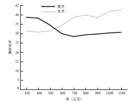 根据图7-1所示,公元541年应该称得上是历史上最著名的年份之一。在那一年(考虑到一定的误差范围,也可以说是公元6世纪中叶),东方的社会发展速度超越了西方,结束了长达14000年的旧格局,并且一举否定了所有简单化并且长期僵化的关于西方统治世界的理论。截至公元700年,东方的社会发展程度比西方高了1/3。到公元1100年,将近40%的巨大差距超过西方占据发展优势的2500年中最大的东西方差距。