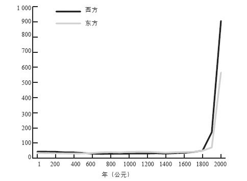 图10-1 世界躁动:过去2000年社会发展状况。此图展示了自1800年来西方引领的发展腾飞,这让世界早期历史中的所有事件变得无足轻重
