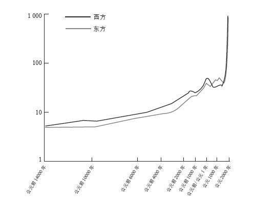 图11-1 历史的发展:东西方社会发展以及硬上限,公元前14000~公元2000年