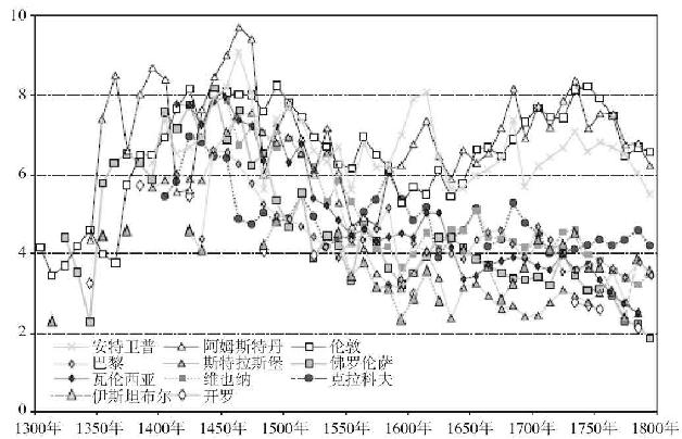 欧洲许多城市自中世纪晚期以来的极其详细的实际工资系列数据,如今都可以得到。这些数据表明整个13世纪和14世纪早期非熟练工人的工资总体减少了;1350年,黑死病加大了土地与劳动力的比率后,工资得到了巨大回升;随着15世纪晚期和16世纪的人口增长,实际工资又逐渐下降了,但是到1600年时,西北欧和南欧、东欧的工资水平拉开了距离:西北欧的工资呈回潮之势,而南欧和东欧仍在继续下跌;1700年时,阿姆斯特丹的非熟练工人的实际工资比在1350年时高出了30%,而伦敦的非熟练工人高出了80%,这两地的工资增长都高于前面提到的能量获取水平的提高。