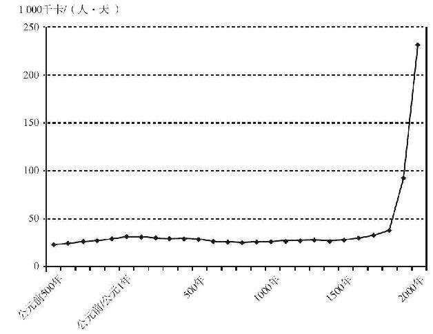 如果对中世纪和近代的能量获取水平的这些估计大致是正确的,那么在1300~1700年这段时期,西方核心地带的能量获取水平一定增长了大约23%,从大约26 000千卡增至大约32 000千卡。这比同样时间跨度的任何其他时期都要快,除了公元前400~前1年这段时间,当时增长了29%——从24 000千卡增至31 000千卡。古代和近代早期增长率和总体分数的近似,说明历史学家们喜欢将这些时期做类比,并非是不合时宜的。