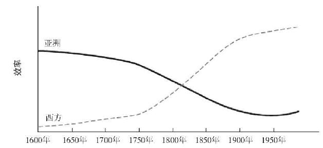 图3.24 罗兹·墨菲关于1600~2000年西方崛起、东方衰退