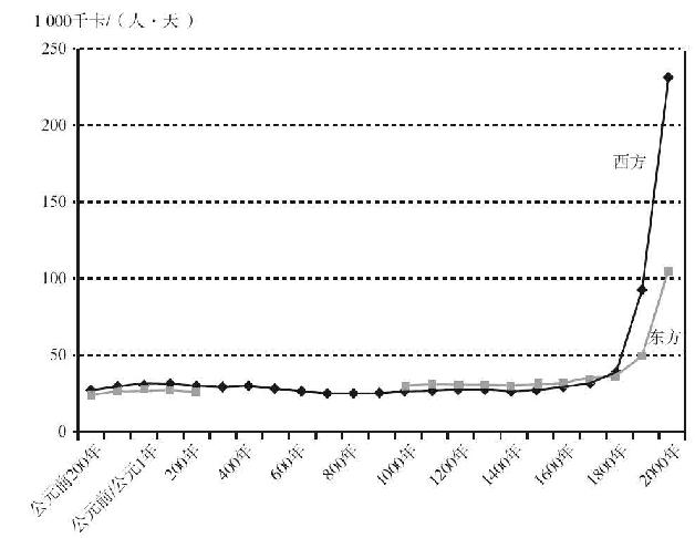 图3.26 公元前200~公元200年和1000~2000年,古代、中古和现代时期东方能量获取状况,及与西方能量获取状况的对比