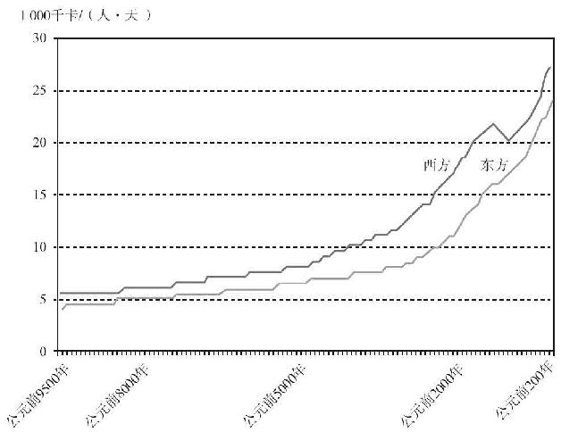 这些估计当然还需要更好的证据支持(无论是西方还是东方),目前都还只是推测而已。但如果这些大致在正确的范围内,那就意味着东方的能量获取水平在大约公元前9500~前3500年这6 000年的时间里大致翻了一番后,在公元前3300~前1300年这2 000年的时间里又翻了一番,然后在公元前1300~前200年这1 100年间又增长了50%。