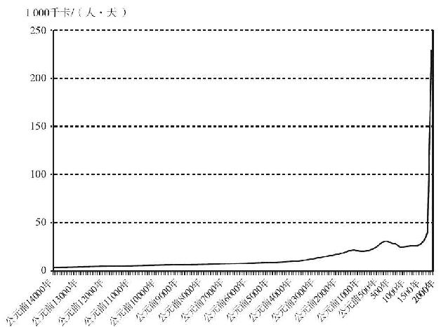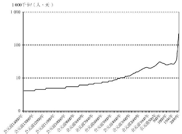 图3.3 公元前14000~公元2000年西方能量获取情况(对数–线性标尺)