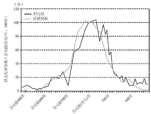 图3.5 船只残骸和铅污染情况所显示的公元前后第一个千年经济增长和下跌情况