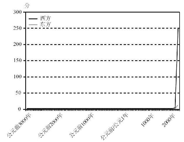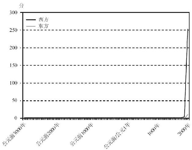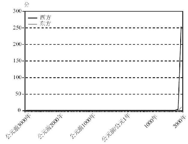 图5.1 公元前3000~公元2000年东方和西方的战争能力(线性-线性标尺)