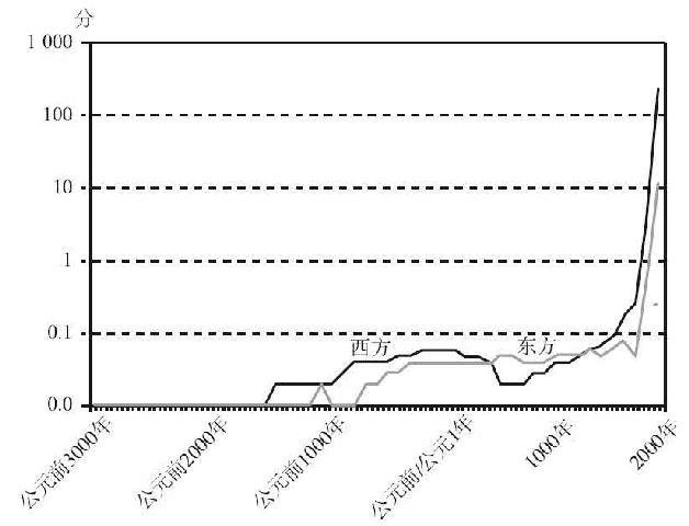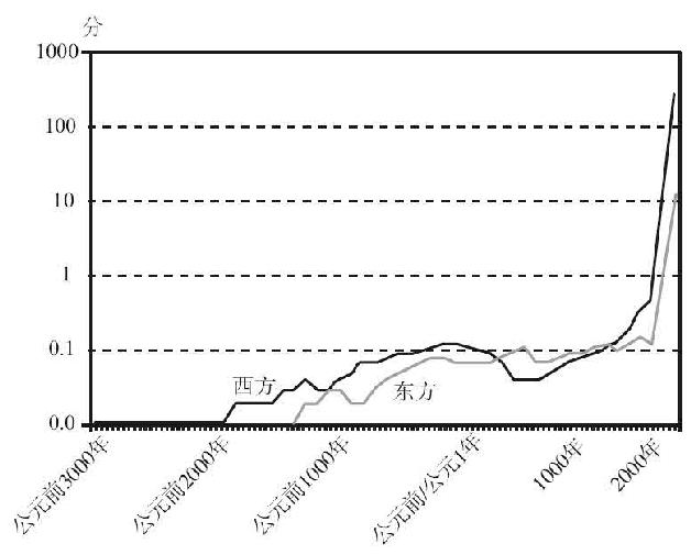 图5.6 公元前3000~公元2000年东方和西方的战争能力(以对数-线性尺度标绘,并将1900年之前的分数降低之后)