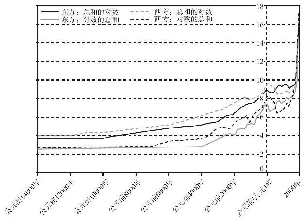 将特性分数的对数相加,也有助于使西方在公元1400~1800年的爆炸式发展显示得更为清楚,强调了现代西方的主宰并不是以“东方的衰落”为基础的:东方社会在1400~1800年间表现得不错,但西方社会表现得更好。前现代时期全球化对西方社会发展的驱动,像公元前最后3个世纪的地中海化对罗马社会发展的驱动一样有利。