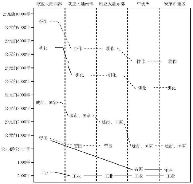 如果将社会发展指数扩展到新世界,就会看到类似事情的确发生了。驯化动植物首先出现在新世界的幸运纬度带,在瓦哈卡地区和秘鲁高原。随着这些地区的社会发展,城市和国家出现了,新的核心地带(即尤卡坦半岛、墨西哥河谷)在最早驯化动植物的地区旁形成了。图7.7是一幅简图,展现了古代复杂社会的5个地区主要的文化转型,加强了人们的这一印象:旧世界和新世界最早的农业核心地带,遵循大致相同的时间表,在很大程度上独立地历经了同样的发展阶段。