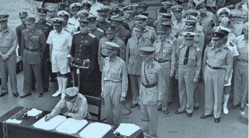 签字仪式只进行了18分钟就结束了,然后,让现场所有人都大为震撼的一幕发生了:整整400架美国当时最先进的B-29轰炸机列队掠过“密苏里”号战舰的上空,队列旁围绕的,又是整整1500架舰载机。