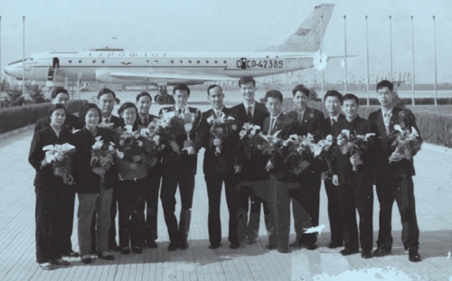 容国团夺得第一个世界冠军回国后,参赛的中国乒乓球队在机场的合影