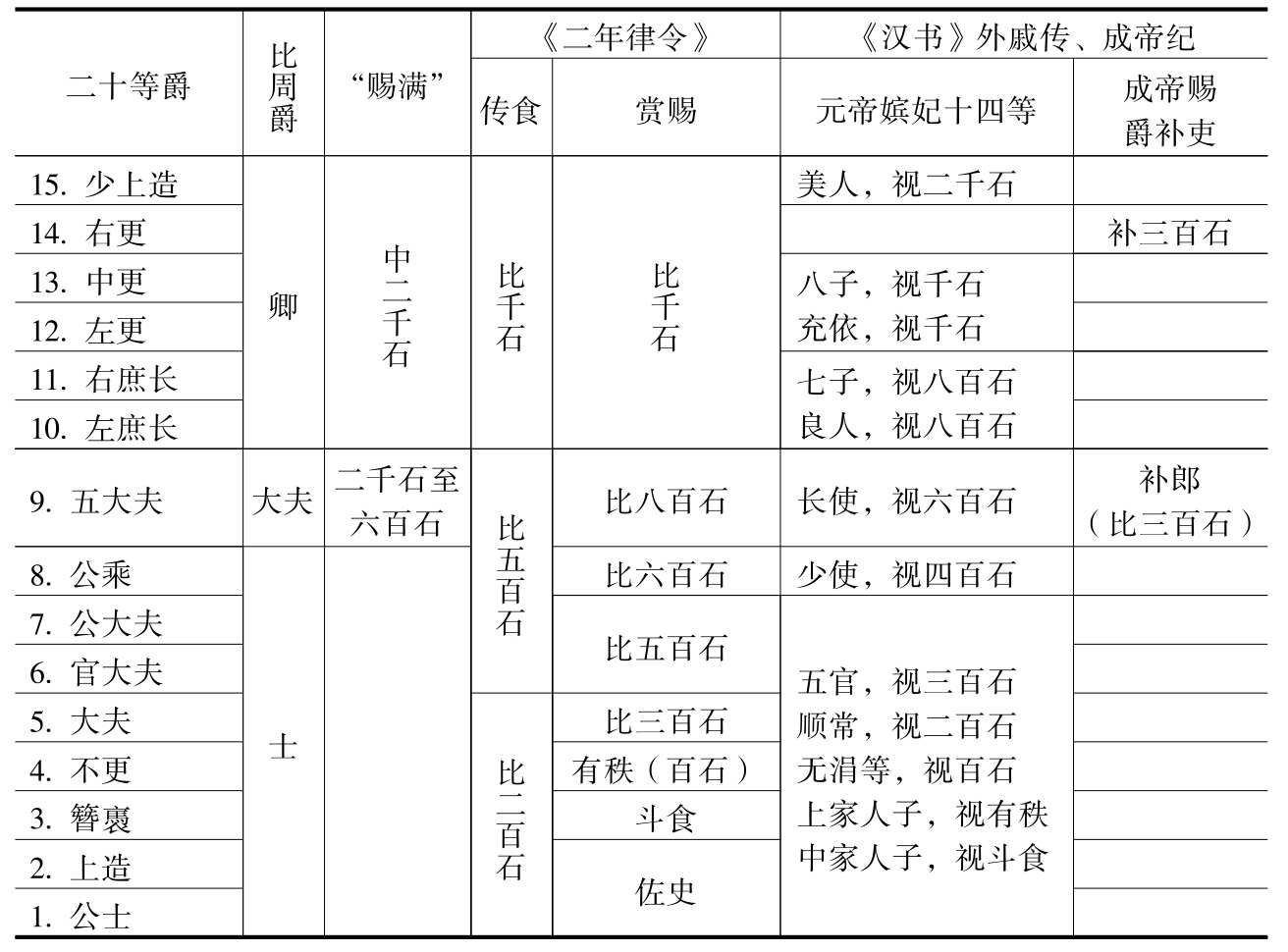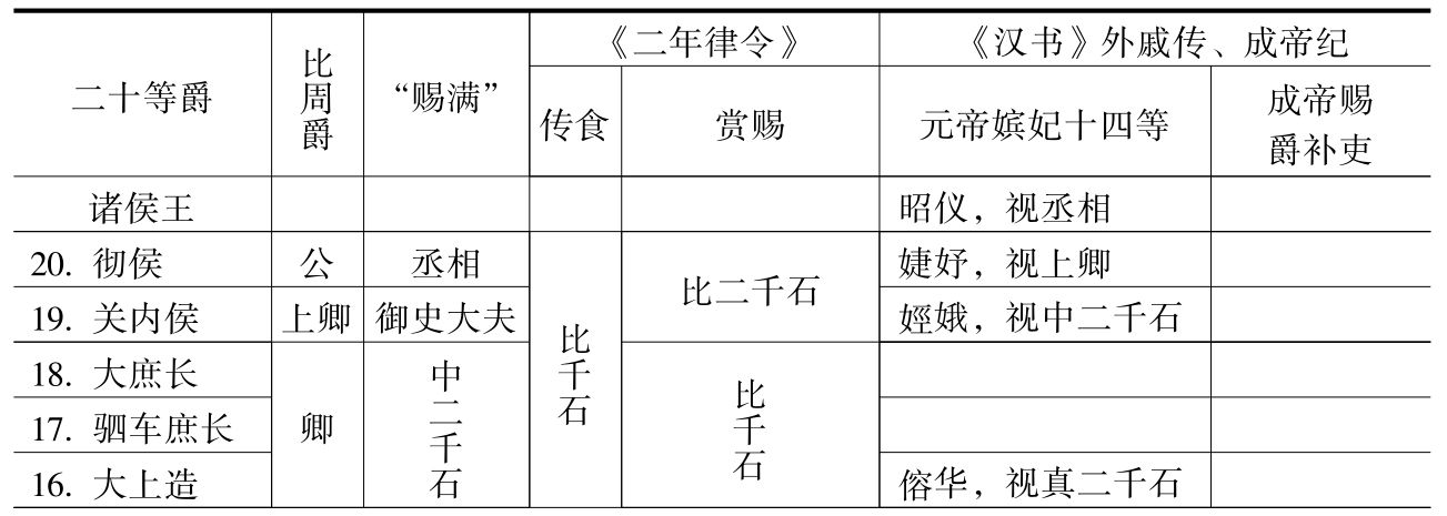 首先讨论“爵、秩相比”现象。在确定薪俸、特权、待遇、资格等“品秩构成要素”时,当局面对着爵、秩两个序列,往往有必要以这个“比”那个,从而把二者联系起来。通过那些爵、秩相“比”的“点”,就可以看清两个序列是如何链接起来的。可供分析的有四种“比”法:第一是《二年律令》传食规定中的爵、秩相比,第二是《二年律令》赏赐规定中的爵、秩相比(75),第三是汉元帝时十四等嫔妃的视若干石、比某某爵的规定(76),第四是汉成帝对出资者赐爵补吏的规定。下将四者一并列表,并列入“赐满”制度以便比较: