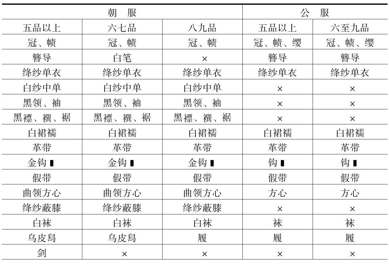 此图表明,具服、公服的形成过程贯穿着三个变化:第一是“级别分等”的强化,第二是“场合分等”的形成,第三是品官成为冠服体制的主体部分而流外官被排斥在外。在朝服与公服分化为二之时,王朝趁热打铁、充实服等,以弁服为“公事之服”,以休闲之服为燕服。燕服并不是随便穿的,它同样有等级区别,要遵从服色。