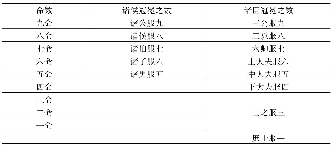 南北朝时,在宇文氏的北周,再度出现了周礼复古之举,满朝文武官职被改头换面,整个塞进了“六官”、“九命”框架,与新莽改制相映生辉。北周官阶,诸侯部分是诸公九命,诸侯八命,诸伯七命,诸子六命,诸男五命;诸臣部分是三公九命,三孤八命,六卿七命,上大夫六命,中大夫五命,下大夫四命,上士三命,中士再命,下士一命。官贵们的车服礼数,都依此排序;能用多少种冠,能用多少种车,都以命数为准。下以冕服为例,列表如下: