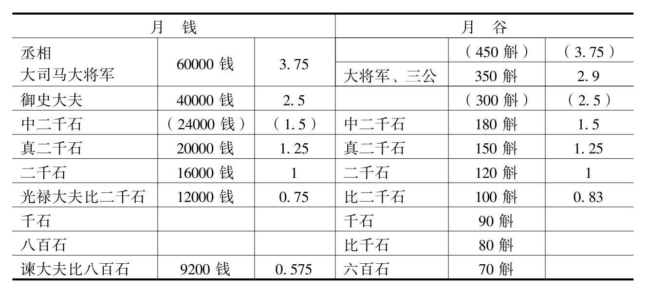 汉代俸额级差的规律性,由此显露出来了。二千石俸额,在月钱和月谷两方面都是指数1,真二千石都是1.25;若综合两汉,就可得到这样一个级差:3.75:2.5:1.5:1.25:1:0.75。由此我们认为,两汉二千石以上诸秩级差,遵循同一规律。表中有几个数字被置于括号之中,它们出自我的推算。下面加以阐释: