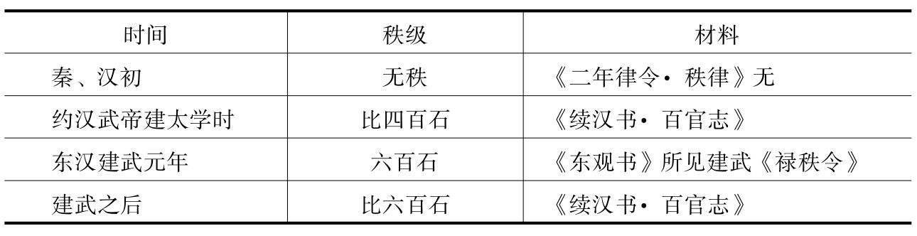此外还有一个旁证,可以强化对博士曾为“比秩”的判断。这就是《续汉书·舆服志》注引《东观书》所载东汉建武《禄秩令》,其最后一段、即“而有秩者……”以下的一段中所列官职,我们认为,大抵都属曾经无秩、后来成为“比秩”的官职,再后又有被调至正秩的。而“博士”一官,恰好就列在建武《禄秩令》的这一部分,秩六百石。那么我们推测,博士最初无秩,随后比四百石,再后六百石。参看下表: