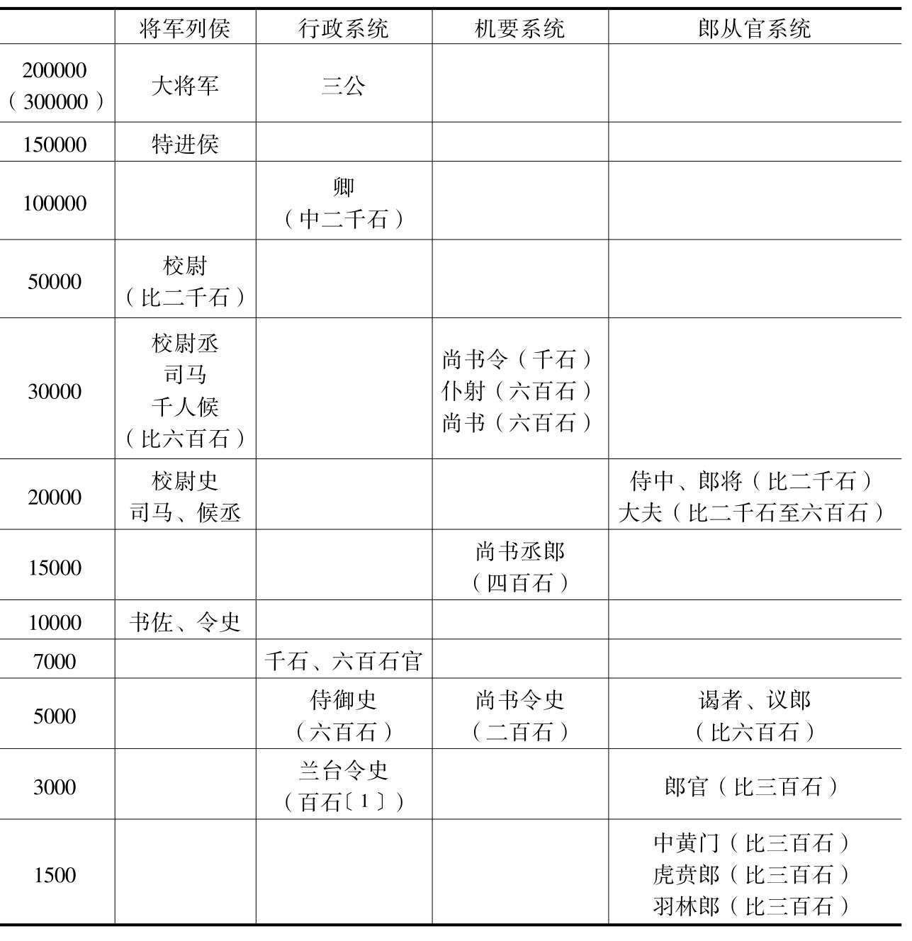 首先能看到军官待遇颇优,校尉比二千石,但腊赐达5万钱,体现了“武官倍于文官”(11)的原则。还能看到尚书诸官的待遇也不错,比同级普通官吏高好几等。最后,也是这里最关注的,就是大夫、将、郎、从官的赏赐额度总体偏低,显示他们自成系统。自成系统的原因很简单:他们“非吏”。