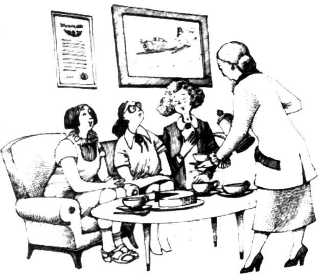 一个高级军官的太太正把咖啡倒进低级军官太太们的杯子里。注意她的伪中上层阶级穿着打扮。